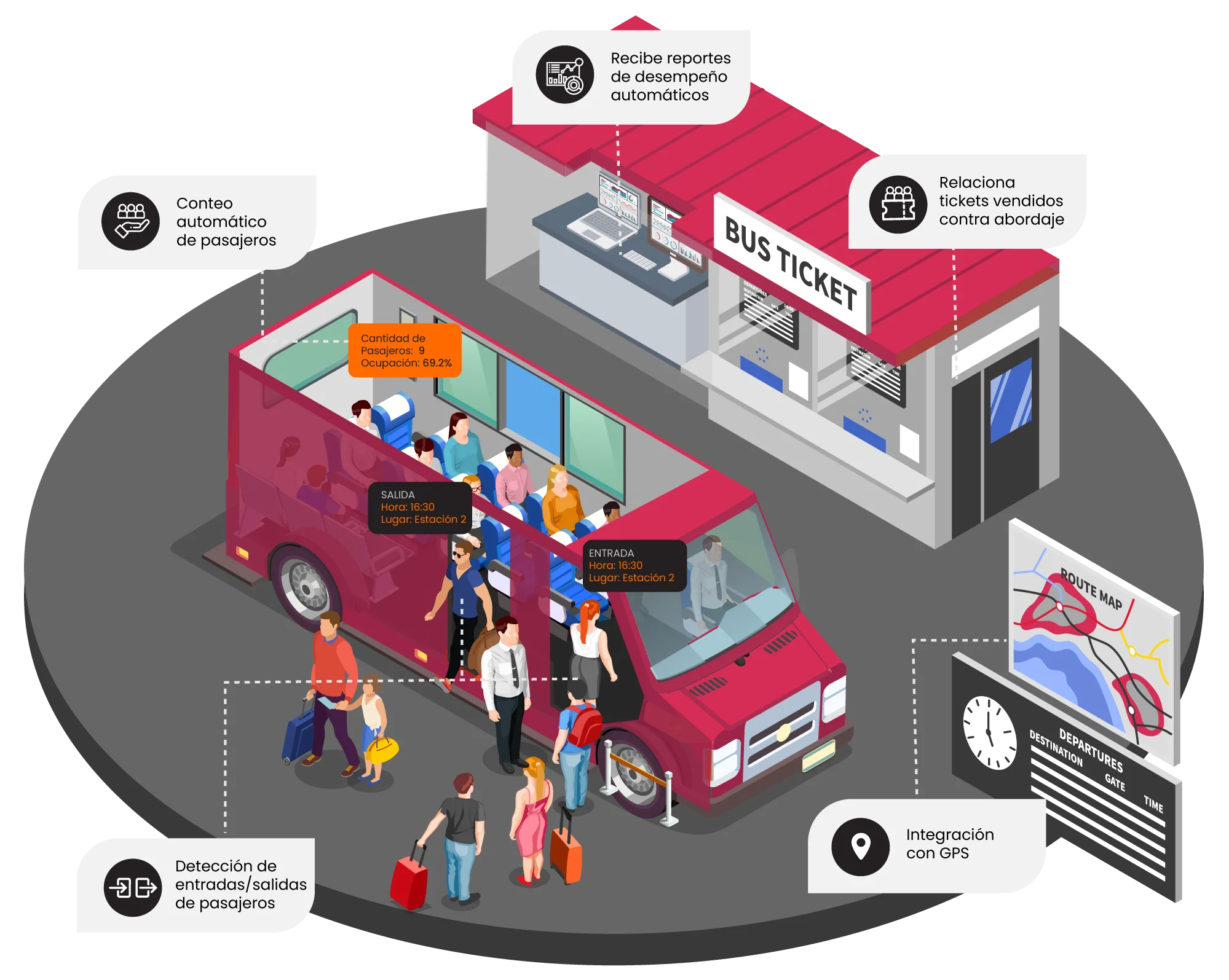 AIVAT utiliza IA y visión por computadora para administrar y optimizar tu red de transporte masivo, mediante un sistema de conteo de pasajeros, que permite conocer en tiempo real y de manera precisa el aforo de unidad, los lugares con mayor/menor afluencia, detección de ascensos y descensos, etc.